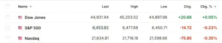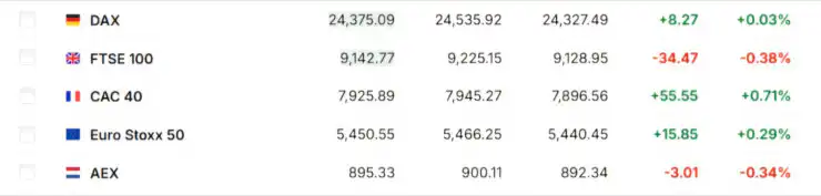 Европейские рынки также демонстрируют смешанную динамику. Индекс FTSE 100 (Великобритания) снизился на 0,38%, что может быть связано с данными о приостановлении роста экономики Европы во II квартале 2025 года. В то же время индексы DAX (+0,03%), CAC 40 (+0,71%) и Euro Stoxx 50 (+0,29%) показали рост.
