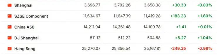 Китайские фондовые индексы также показывают рост, поддерживаемый новостями о ликвидности от Народного банка Китая и увеличении инвестиций в основные фонды. Индекс Shanghai Composite вырос на 0,83%, в то время как индекс Hang Seng снизился на 0,98%.
