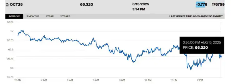 Цены на нефть снизились на фоне ожиданий результатов встречи Трампа и Путина. Смягчение санкций против российского нефтяного сектора может стать возможным в случае прогресса в урегулировании конфликта. Цена октябрьских фьючерсов на нефть марки Brent упала на 0,77% до 66,32 доллара за баррель, а сентябрьские фьючерсы на нефть марки WTI снизились на 0,79% до 63,45 доллара за баррель.