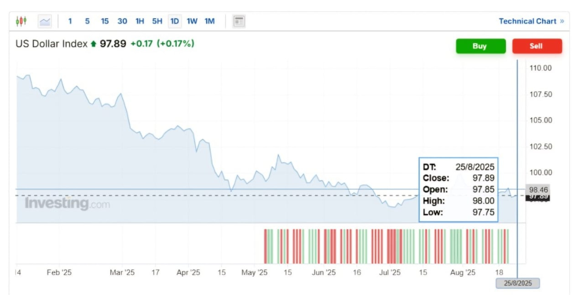 U.S. Dollar Index (DXY) повысился на 0,17%, что указывает на укрепление доллара США по отношению к корзине основных мировых валют.