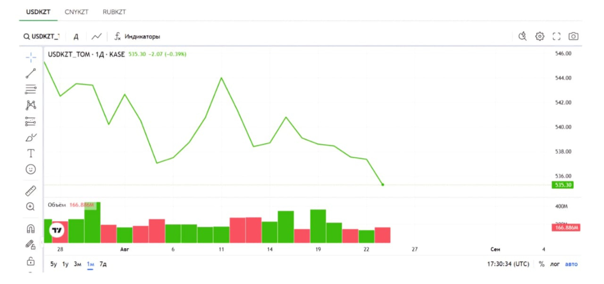 Курс доллара по отношению к тенге снизился до минимума с начала августа. По итогам дневных торгов на Казахстанской фондовой бирже KASE средневзвешенный курс доллара составил 535,87 тенге, снизившись на 1,49 тенге. С начала августа курс доллара снижался максимум до 536,58 тенге (6 августа). Официальный курс Национального банка на 25 августа составляет 537,34 тенге за доллар.