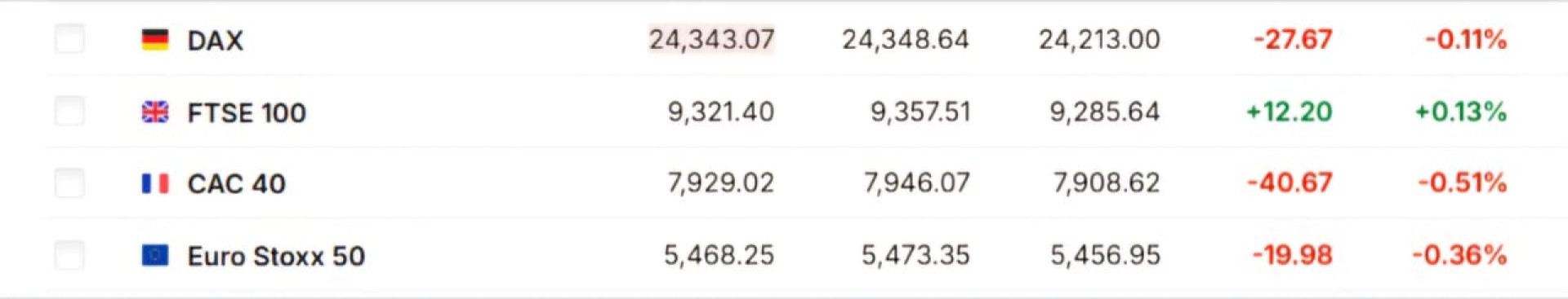 Из основных индексов FTSE 100 (Великобритания) вырос на 0,13%, в то время как DAX (-0,11%, Германия), CAC 40 (-0,51%, Франция) и Euro Stoxx 50 (-0,36%) показали снижение.