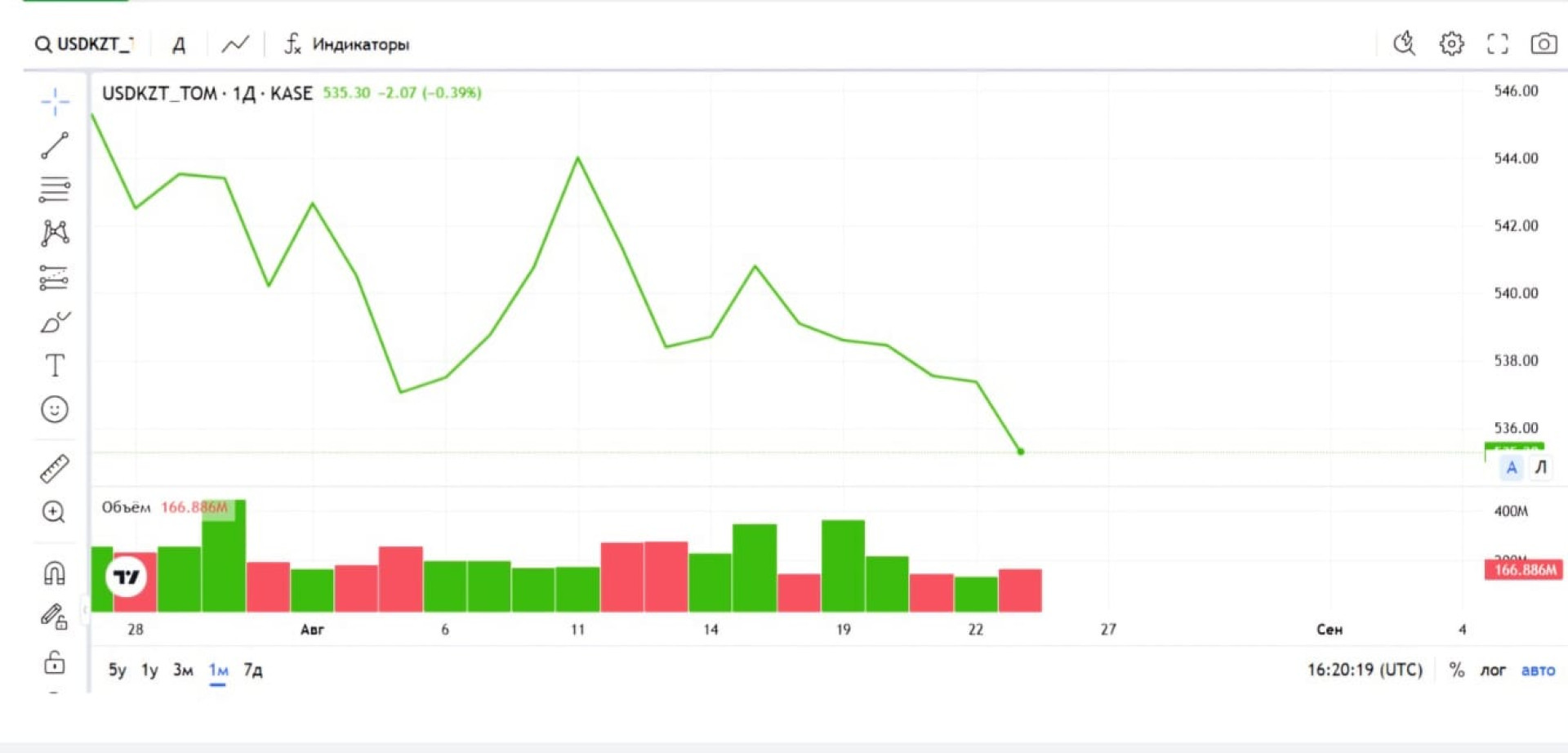 По итогам торгов на Казахстанской фондовой бирже (KASE) средневзвешенный курс доллара составил 533,87 тенге, снизившись на 2 тенге. Официальный курс Национального банка на 26 августа составляет 535,99 тенге за доллар.