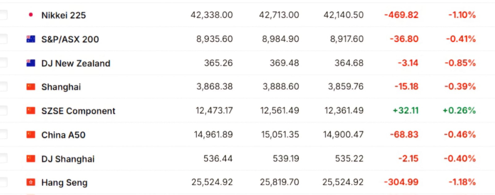 Азиатские рынки также оказались в красной зоне, за исключением индекса SZSE Component, который показал рост на 0,26 процента. Индекс Nikkei 225 в Японии снизился на 1,10 процента, а китайские индексы Shanghai Composite и Hang Seng закрылись с потерями -0,39 и -1,18 процента соответственно.