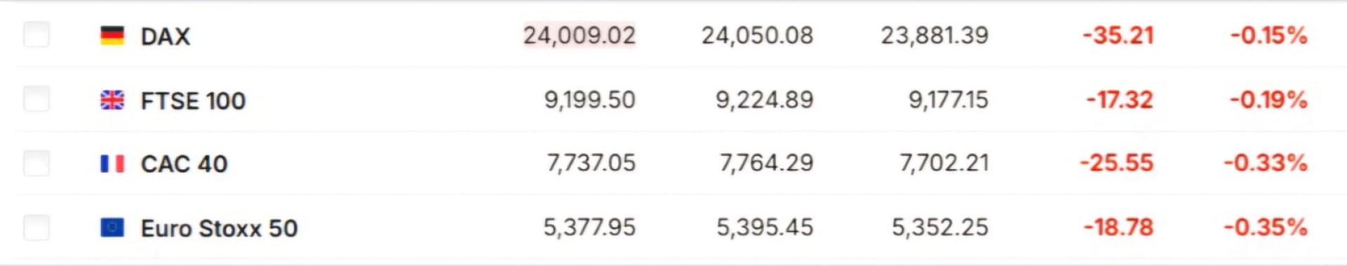 - Основные индексы: FTSE 100 (-0,19%, Великобритания), DAX (-0,15%, Германия), Euro Stoxx 50 (-0,35%, включает 50 крупнейших компаний еврозоны), CAC 40 (-0,33%, Франция) показали снижение из-за ожидания важных данных по инфляции из США и ЕС, а также политической нестабильности во Франции.