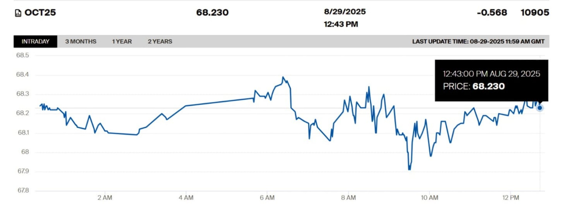 - Цена октябрьских фьючерсов на нефть марки Brent на лондонской бирже ICE снизилась на 0,56% - до 68,23 доллара за баррель.