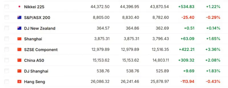 Азиатские рынки практически все оказались в зелёной зоне на фоне ожиданий снижения процентных ставок Федеральной резервной системы США. В Японии индекс Nikkei 225 поднялся на 1,22 процента благодаря сильным результатам в технологическом и энергетическом секторах. Фондовый китайский индекс Shanghai Composite (+1,65 процента) также закрылся в плюсе из-за подъема акций в индустрии искусственного интеллекта и технологическом секторе. В то же время Hang Seng немного снизился на 0,43 процента, несмотря на общие позитивные настроения.