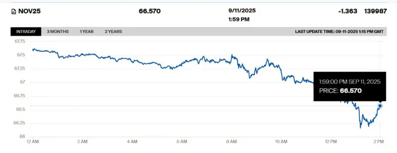 Цена ноябрьских фьючерсов на нефть марки Brent на лондонской бирже ICE снизилась на 1,36 процента, составив 66,57 доллара за баррель.