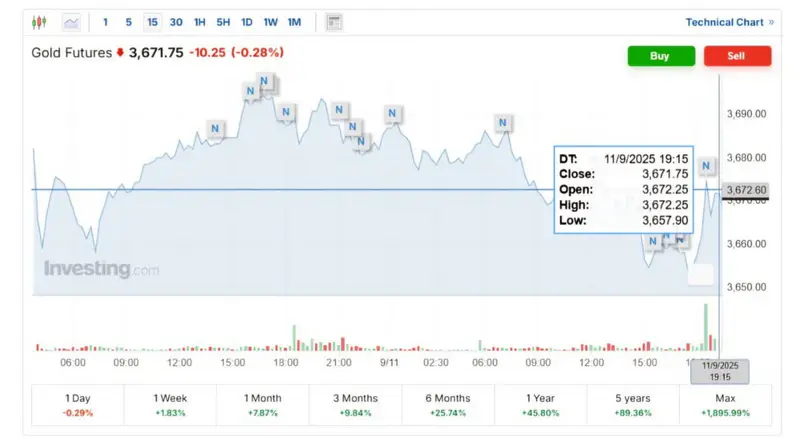 Фьючерс на золото снизился на 0,28 процента, составив 3 671,75 доллара за унцию, что связано с положительными данными по инфляции в США.