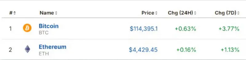 Курс Bitcoin (BTC) подорожал на 0,63 процента, а Ethereum (ETH) - на 0,16 процента, составив 4 429,45 доллара за одну монету. Это связано с ожиданиями, что ФРС снизит ставки, что делает рискованные активы, такие как BTC и ETH, более привлекательными.