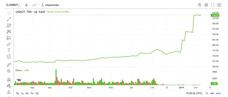 По итогам торгов на Казахстанской фондовой бирже (KASE, на 17:00 по времени Астаны) средневзвешенный курс доллара составил 539,08 тенге, повысившись на 0,84 тенге. Официальный курс Национального банка на 11 сентября составляет 538,2 тенге за доллар.