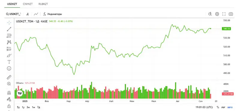 Официальный курс Национального банка на 15 сентября составляет 540,84 тенге за доллар.
