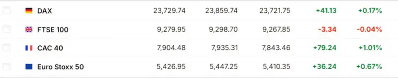 Из основных индексов DAX (+0,17 процента, Германия), CAC 40 (+1,01 процента, Франция), Euro Stoxx 50 (+0,67 процента) оказались в плюсе, в то время как FTSE 100 немного снизился (-0,04 процента, Великобритания).