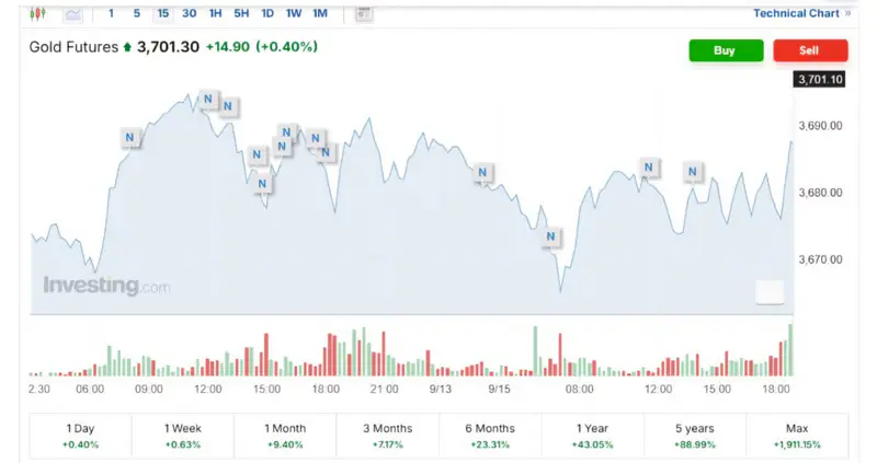 Фьючерс на золото повысился на 0,40 процента - до 3 701,30 доллара за унцию.