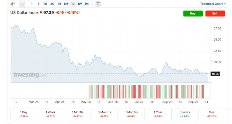 U.S. Dollar Index (DXY) ослаб на 0,16 процента на фоне ожиданий снижения процентной ставки ФРС США и слабых данных по рынку труда, что заставляет инвесторов переводить средства в другие валюты.
