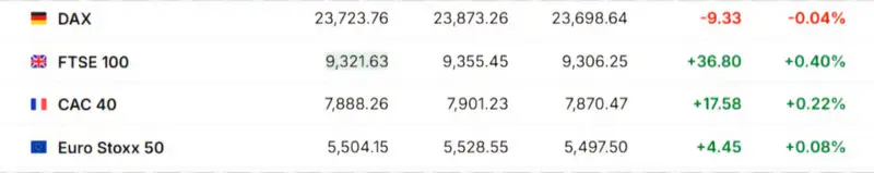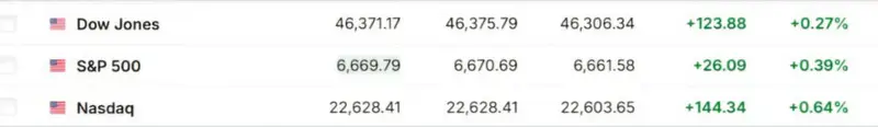 Европейские рынки также показали положительную динамику. Индексы FTSE 100 (+0,40 процента), CAC 40 (+0,22 процента) и Euro Stoxx 50 (+0,08 процента) выросли, в то время как индекс DAX немного снизился на 0,04 процента.