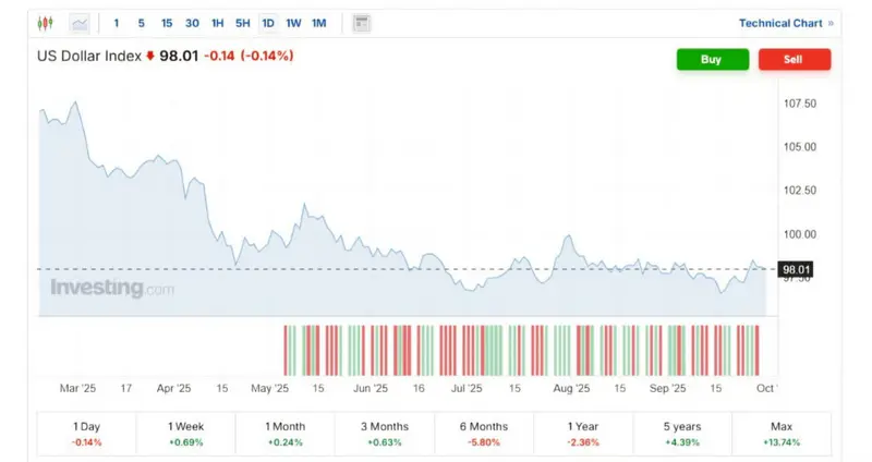Индекс доллара США (U.S. Dollar Index, DXY) снизился на 0,14 процента. Это снижение связано с рисками, связанными с возможным закрытием правительства США, а также с фиксацией прибыли инвесторами в ожидании снижения ставок Федеральной резервной системы.