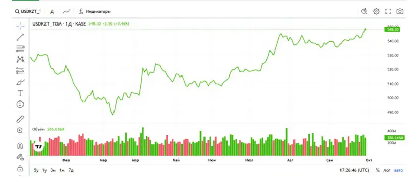На Казахстанской фондовой бирже (KASE) по состоянию на 17:00 по времени Астаны средневзвешенный курс доллара составил 548,77 тенге, увеличившись на 4,32 тенге. Официальный курс Национального банка на 29 сентября составляет 544,26 тенге за доллар.
