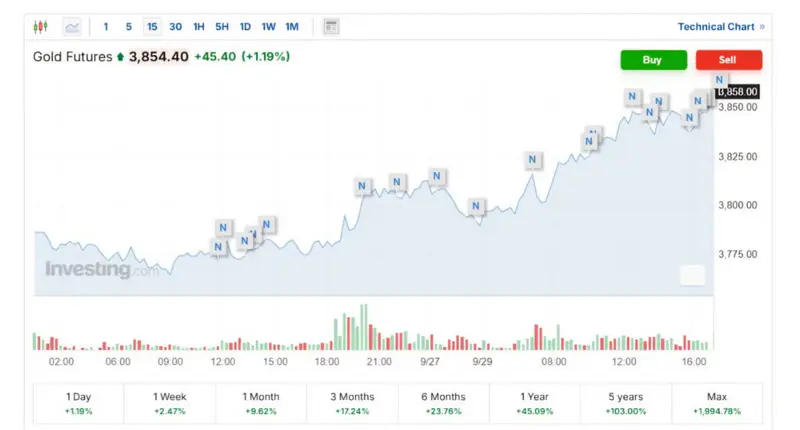 Золото достигло рекордного уровня, пробив отметку 3 854,40 доллара за унцию, что связано с активными покупками центробанками для увеличения резервов на фоне геополитической напряженности и ожидания приостановки работы правительства США.