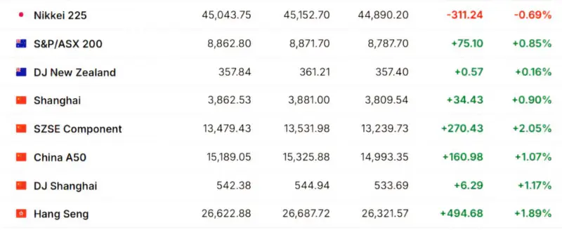 Азиатские рынки в целом закрылись в положительной зоне. Индекс Shanghai Composite вырос на 0,90 процента, а Hang Seng - на 1,89 процента, что связано с ожиданиями экономического стимулирования со стороны правительства. В Японии индекс Nikkei 225 снизился на 0,69 процента.