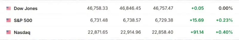 Американские рынки открылись в зеленой зоне. Несмотря на продолжающееся частичное закрытие правительства США, инвесторы сохраняют оптимизм, ориентируясь на перспективы технологического сектора и ожидания экономических изменений. Индекс Dow Jones незначительно понизился на 0,05 процента, в то время как S&P 500 повысился на 0,23 процента, а NASDAQ - на 0,40 процента.