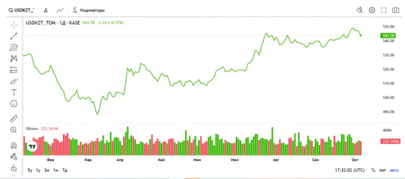По итогам торгов на Казахстанской фондовой бирже (KASE, на 17:00 по времени Астаны) средневзвешенный курс доллара составил 545,26 тенге, понизившись на 2,2 тенге. Официальный курс Национального банка на 6 октября составляет 547,57 тенге за доллар.