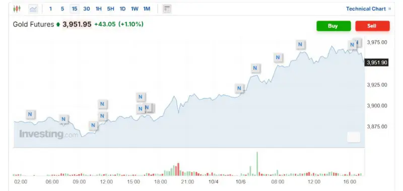 Золото обновило рекорд, поднявшись выше 3 950 долларов за унцию на фоне повышенного спроса на безопасные активы из-за частичного закрытия правительства США, ожиданий снижения ставок и экономической неопределенности. Фьючерс на золото повысился на 1,10 процента - до 3 951,95 доллара за унцию.