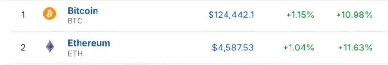 Курс Bitcoin (BTC) подорожал на 1,15 процента, Ethereum (ETH) - на 1,04 процента до 4 587,53 доллара за одну монету из-за растущего интереса инвесторов к криптовалютам как к безопасным активам, притока средств в криптофонды и ожиданий снижения процентных ставок в США.