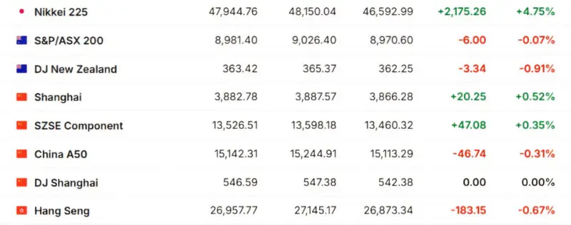 В Японии индекс Nikkei 225 повысился на 4,75 процента, достигнув рекорда на фоне назначения Санаэ Такаити главой правящей партии, что привлекло инвесторов.