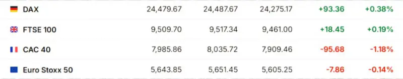 Европейские рынки также показали разнонаправленную динамику. Из основных индексов FTSE 100 (+0,38 процента, Великобритания) и DAX (+0,19 процента, Германия) оказались в плюсе, в то время как CAC 40 (-1,18 процента, Франция) и Euro Stoxx 50 (-0,14 процента) показали снижение.