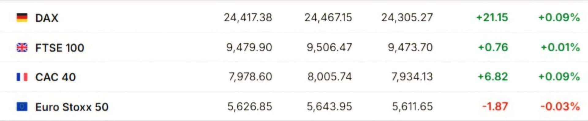 Европейские рынки в целом показали положительную динамику. Основные индексы, такие как FTSE 100 (+0,01 процента, Великобритания), CAC 40 (+0,09 процента, Франция) и DAX (+0,09 процента, Германия), оказались в плюсе. Однако индекс Euro Stoxx 50 (-0,03 процента) показал снижение.