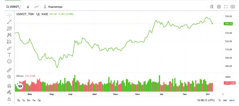 На Казахстанской фондовой бирже (KASE) по состоянию на 17:00 по времени Астаны средневзвешенный курс доллара составил 540,08 тенге, что на 1,37 тенге ниже предыдущего значения. Официальный курс Национального банка на 8 октября составляет 541,63 тенге за доллар.