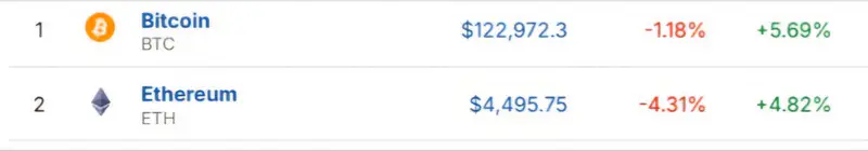 Курс Bitcoin (BTC) снизился на 1,18 процента, а Ethereum (ETH) упал на 4,31 процента, составив 4 495,75 доллара за монету. Инвесторы ищут более надёжные активы на фоне неопределенности, связанной с приостановкой работы правительства США, что затрудняет публикацию ключевых экономических данных.