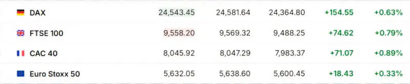 Европейские рынки показали положительную динамику. Основные индексы, такие как FTSE 100 (+0,79 процента, Великобритания), CAC 40 (+0,89 процента, Франция) и DAX (+0,63 процента, Германия), оказались в плюсе. Акции сталелитейных компаний активно дорожают на фоне предложений о введении тарифов на импорт стали, что воспринимается как защита европейских производителей.