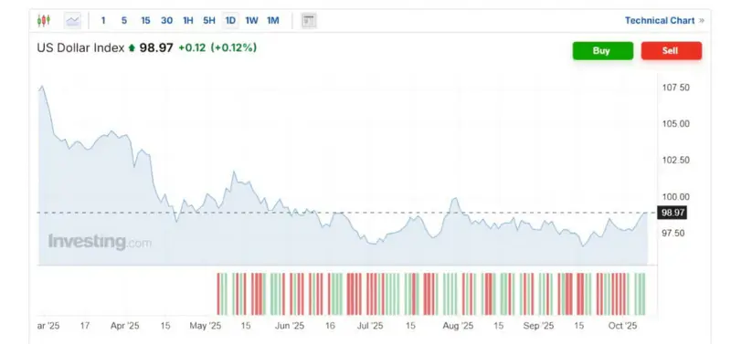Индекс доллара США (U.S. Dollar Index, DXY) укрепился на 0,12 процента, в частности, из-за ослабления евро и иены: европейская политика нестабильна, а в Японии ожидаются стимулирующие меры, что снижает привлекательность их валют.