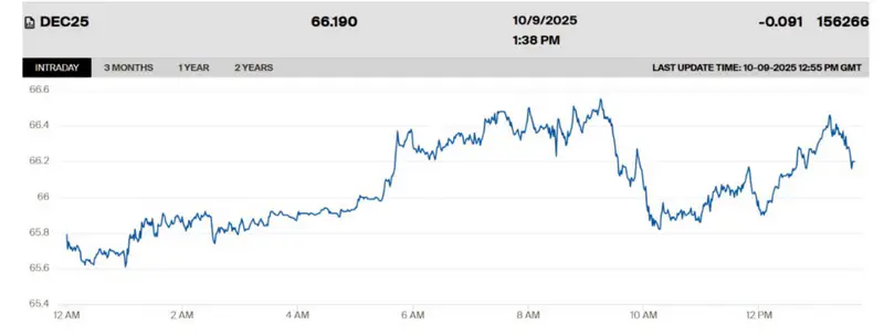 Цена декабрьских фьючерсов на нефть марки Brent на лондонской бирже ICE понизилась на 0,09 процента - до 66,19 доллара за баррель.