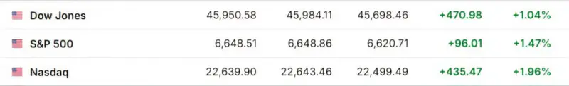 Американские рынки также открылись в положительной зоне, что связано с смягчением риторики президента Трампа по торговой напряженности с Китаем и ожиданиями снижения ставок. Индекс Dow Jones повысился на 1,04%, S&P 500 - на 1,47%, NASDAQ - на 1,96%.