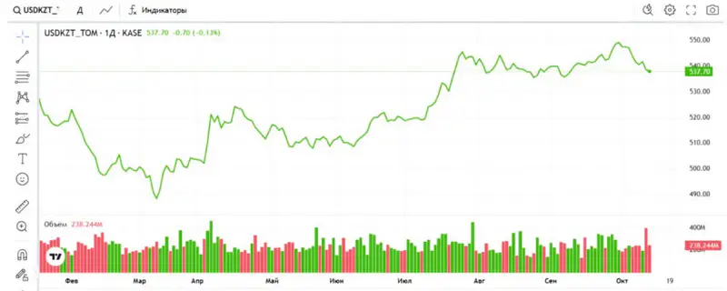 На Казахстанской фондовой бирже (KASE) по итогам торгов на 17:00 по времени Астаны средневзвешенный курс доллара составил 537,71 тенге, что на 1,22 тенге ниже предыдущего значения. Официальный курс Национального банка на 13 октября составляет 539,06 тенге за доллар.