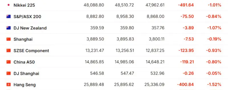 Азиатские рынки показали отрицательную динамику. Заявления президента США о повышении пошлин на китайские товары вызвали опасения по поводу ухудшения торговых отношений, что негативно сказалось на настроениях инвесторов. Индекс Shanghai Composite снизился на 0,19%, Hang Seng - на 1,52%, а японский индекс Nikkei 225 понизился на 1,01%.