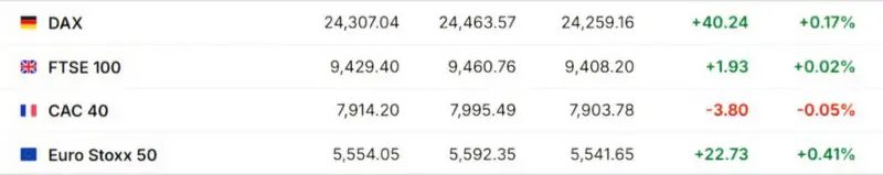 Европейские рынки в целом показали положительную динамику. Заявления Трампа о том, что "всё будет в порядке" и что США не планируют "наносить ущерб" Китаю, снизили страхи инвесторов и поддержали рост европейских индексов. Основные индексы, такие как FTSE 100 (+0,02%), Euro Stoxx 50 (+0,41%), DAX (+0,17%), показали рост, в то время как CAC 40 (-0,05%) немного снизился.