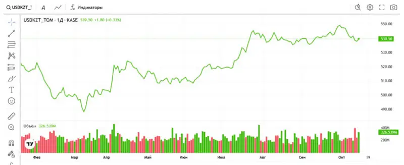 По итогам торгов на Казахстанской фондовой бирже (KASE) на 17:00 по времени Астаны средневзвешенный курс доллара составил 538,93 тенге, повысившись на 1,22 тенге. Официальный курс Национального банка на 14 октября составляет 537,77 тенге за доллар.