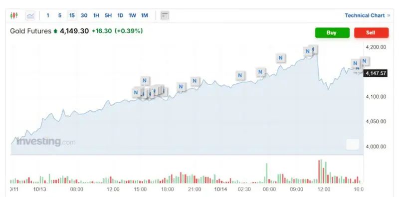 Золото подорожало, оставаясь выше рекордного уровня на фоне глобальной экономической неопределенности и геополитической напряженности. Фьючерс на золото повысился на 0,39% - до 4 149,30 доллара за унцию.