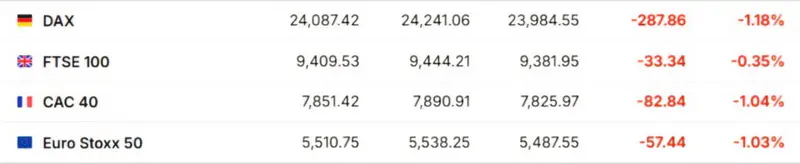 Европейские рынки также показали отрицательную динамику из-за опасений инвесторов на фоне конфликтных американско-китайских отношений. Основные индексы: FTSE 100 (-0,35%, Великобритания), Euro Stoxx 50 (-1,03%, еврозона), DAX (-1,18%, Германия), CAC 40 (-1,04%, Франция).