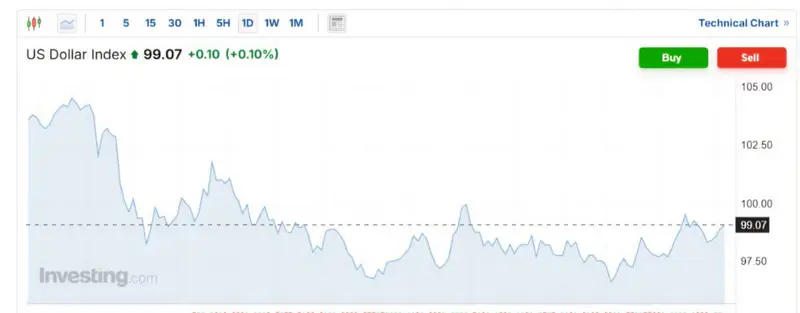 Индекс доллара США (U.S. Dollar Index, DXY) увеличился на 0,10 процента. Это связано с возвращением инвесторов к американской валюте как к безопасному активу, а также с ослаблением фунта на фоне слабых данных по инфляции в Великобритании.