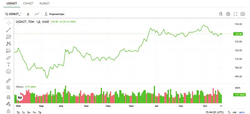На Казахстанской фондовой бирже (KASE) по состоянию на 15:30 по времени Астаны средневзвешенный курс доллара составил 538,53 тенге, что на 0,08 тенге ниже предыдущего значения. Официальный курс Национального банка на 22 октября составляет 538,56 тенге за доллар.
