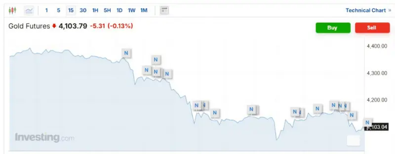 Золото продолжает терять в цене, так как инвесторы переключаются на другие активы в условиях укрепления доллара и роста доходности казначейских облигаций США. Фьючерс на золото снизился на 0,13 процента, достигнув 4 103,79 доллара за унцию.