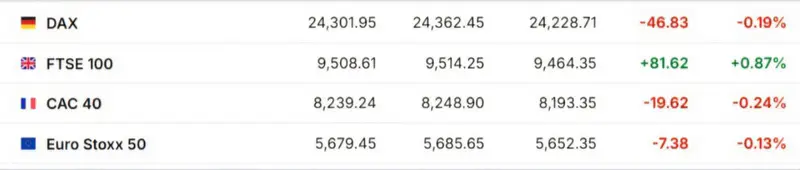 Европейские рынки показали разнонаправленную динамику. Большинство индексов, таких как DAX и CAC 40, снизились под давлением слабых корпоративных отчётов и возросшей геополитической неопределённости, в то время как FTSE 100 вырос благодаря более мягким, чем ожидалось, данным по инфляции в Великобритании, что снизило риск незапланированного повышения ставок. Из основных индексов Euro Stoxx 50 (-0,13 процента), DAX (-0,19 процента), CAC 40 (-0,24 процента) снизились, в то время как FTSE 100 (+0,87 процента) показал рост.