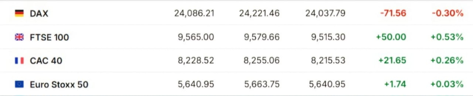Европейские рынки показали разнонаправленную динамику. Из основных индексов Euro Stoxx 50 (+0,03 процента), CAC 40 (+0,26 процента), FTSE 100 (+0,53 процента) показали рост. При этом DAX (-0,30 процента) снизился.