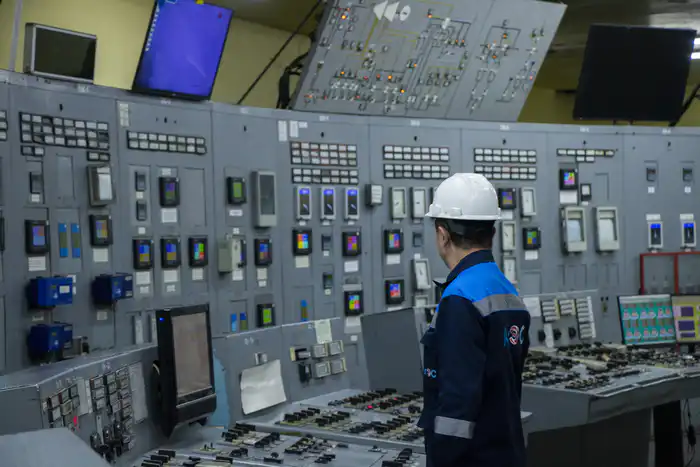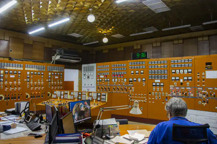 Диспетчеры контролируют выработку тепловой энергии и наблюдают за всеми цехами с помощью главного щита управления, где расположены рычаги и датчики.