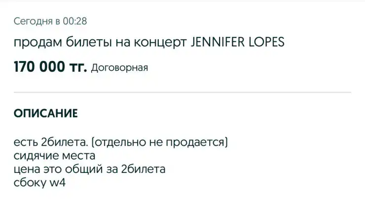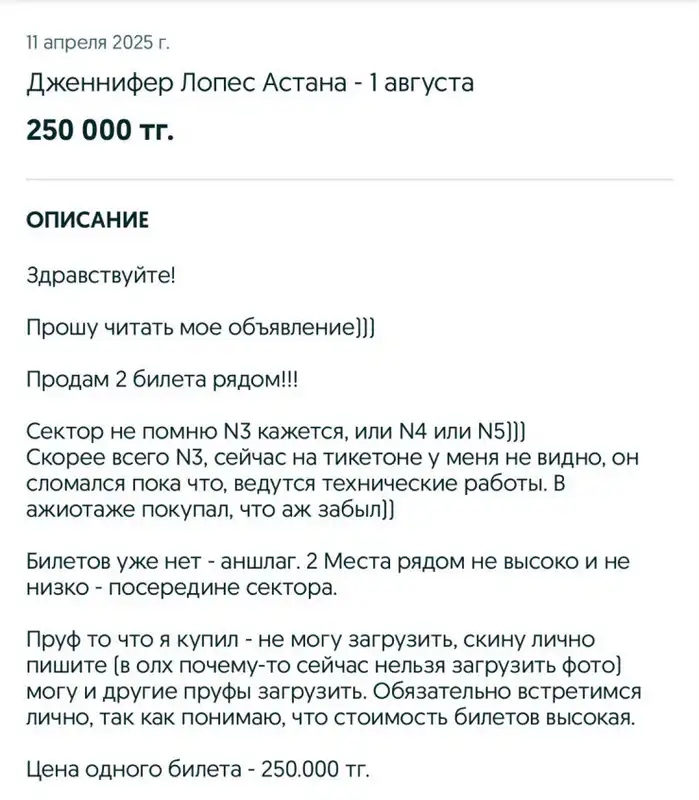 Один из продавцов так спешил купить и перепродать билеты, что забыл, какие места у него. Сайт завис, проверить информацию невозможно, но он уверяет, что билеты есть. В объявлении он упомянул, что тоже пойдет на концерт, предлагая купить за 250 тысяч тенге. Официальные же цены варьировались от 40 до 150 тысяч тенге.